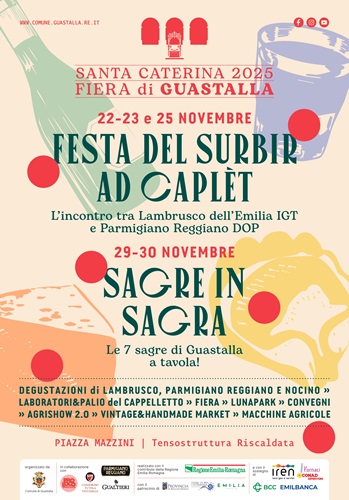 La Festa del Surbir ad Caplèt (22, 23 e 25 novembre) è l’epicentro delle celebrazioni enogastronomiche, con la cucina aperta tutto il giorno e ampio spazio a degustazioni di Lambrusco dell’Emilia IGT e Parmigiano Reggiano DOP.