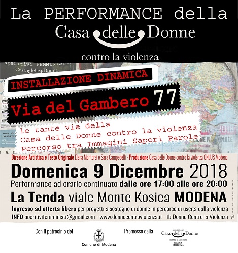 Domenica 9 alle 17 alle 20, infine, la settimana della “Tenda” si conclude con l’installazione, visitabile a ciclo continuo, “Via del Gambero 77 – La performance”, a cura di Casa delle Donne contro la violenza di Modena, che propone un percorso tra immagini, sapori e parole che permetterà alle donne e agli uomini che vorranno partecipare di camminare tra stanze incontrando racconti, discussioni, pensiero politico. Nell’installazione dinamica si può entrare, sentire, vedere, toccare, spostare, attraversare, commentare, assaggiare, parlare, camminare, uscire, seguendo un proprio percorso, il proprio personale istinto, la propria curiosità. In uno spazio, che contiene altri spazi, attraverso i quali ci si può muovere creando un itinerario libero, nel rispetto della propria autodeterminazione, che da sempre muove le donne nel pensiero e nell’azione. Per informazioni sull’installazione sensoriale si può andare a www.donnecontroviolenza.it o scrivere a aperitivifemministi@gmail.com.