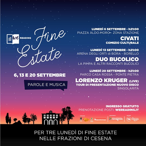 CESENA – Continuano anche a settembre le iniziative di “Cesena Riparte – Che spettacolo!”. A partire da lunedì 6 settembre torna infatti la rassegna “Fine Estate” che proporrà alla città, e al territorio tutto, una serie di appuntamenti tra letture e musica con Giuseppe Civati, Duo Bucolico e Lorenzo Kruger per 3 lunedì nelle frazioni di Cesena. Nata la scorsa estate all’interno del Chiostro di San Francesco per la seconda edizione esce dalle mura del centro storico e, grazie alla volontà di We Reading e dell’Amministrazione comunale, diventa un percorso itinerante che toccherà spazi, arene e parchi nelle frazioni di Cesena.