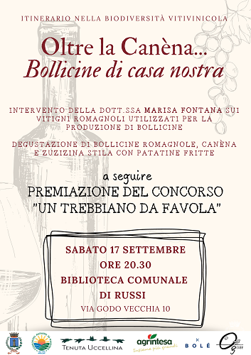 Sabato 17 settembre, alle 20.30, presso la Biblioteca Comunale di Russi incontro divulgativo sui vitigni romagnoli usati nella produzione di bollicine e premiazione del concorso “Un trebbiano da favola”