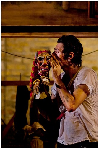 Ma il protagonista dello spettacolo è Sandrone, il re contadino senza corona, il paesano dalla voce cavernosa che non riesce a parlare italiano e si inventa una lingua tutta sua, surreale e straniante. Una sorta di Augusto stralunato e feroce che tra uno strafalcione e l’altro si apre in voragini di malinconia.