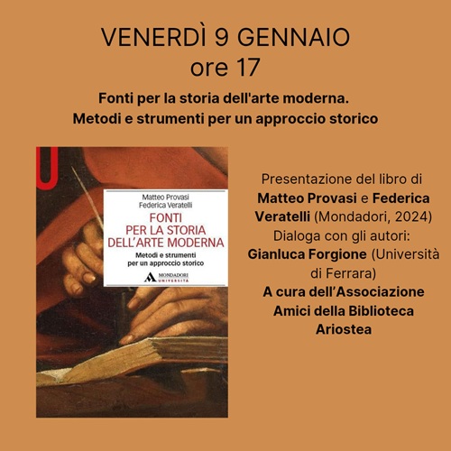 FERRARA – Esplora le potenzialità di un approccio alla storia dell’arte basato sull’analisi di nuovi tipi di documenti il libro di Matteo Provasi e Federica Veratelli (Mondadori, 2024) dal titolo “Fonti per la storia dell’arte moderna” che venerdì 9 gennaio 2026, alle 17:00, sarà presentato nella sala Agnelli della biblioteca comunale Ariostea (via Scienze 17, Ferrara).