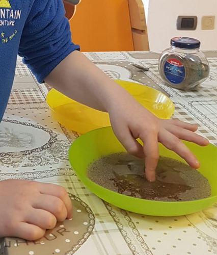 1) “Esperimento Coronavirus”, con sapone e pepe. Toccando prima il pepe poi il sapone, i bambini hanno scoperto che il sapone “fa scappare il pepe”, che metaforicamente rappresenta il Coronavirus. Da qui, hanno riflettuto sull’importanza di lavarsi le manine per allontanare il virus.