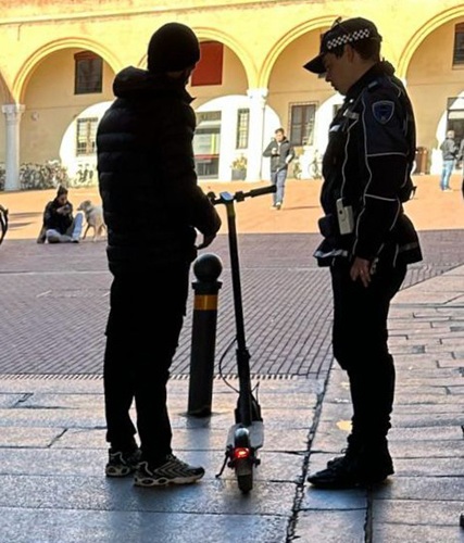 Il ragazzo ha però proseguito la corsa, urtando un’agente: il manubrio del monopattino l’ha colpita al petto, mentre la ruota le ha colpito lo stinco. Subito dopo il 19enne ha abbandonato il mezzo ed è fuggito a piedi sotto i portici, inseguito dagli agenti che lo hanno mantenuto sempre a vista. Durante la fuga si è liberato dello zaino, lanciando oltre la strada un involucro, nel tentativo di disfarsene. L’inseguimento si è concluso poco dopo in un piazzale vicino, dove il giovane è stato raggiunto e bloccato, anche grazie all’intervento di altri operatori sopraggiunti in supporto.