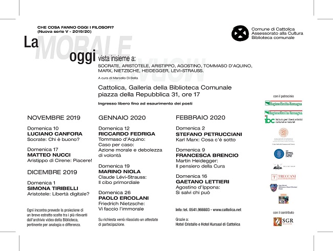 CATTOLICA (RN) – GAETANO LETTIERI chiude DOMENICA 16 FEBBRAIO, alle 17 nella Galleria della Biblioteca comunale di Cattolica, con la conferenza dal titolo “Si salvi chi può”, il ciclo 2019/20 della storica rassegna “Che cosa fanno oggi i filosofi?” dedicata alla morale contemporanea “in compagnia” di grandi autori, antichi e moderni.