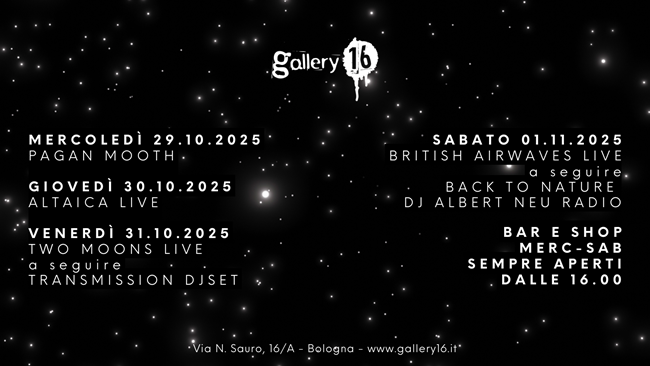 BOLOGNA – Gallery16 è lo shop di dischi, libri e il cocktail bar che vi aspetta con una programmazione sempre ricca di eventi live, presentazioni, djset e molto altro.