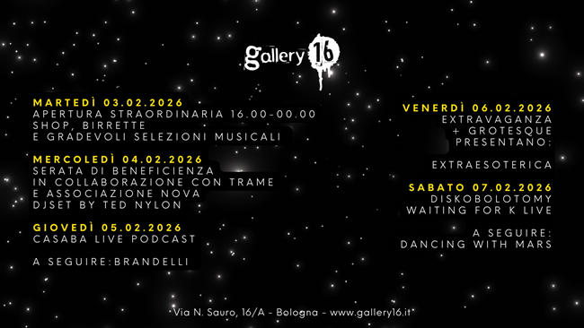 BOLOGNA – Gallery16 è lo shop di dischi, libri e il cocktail bar che vi aspetta con una programmazione sempre ricca di eventi live, presentazioni, djset e molto altro.
