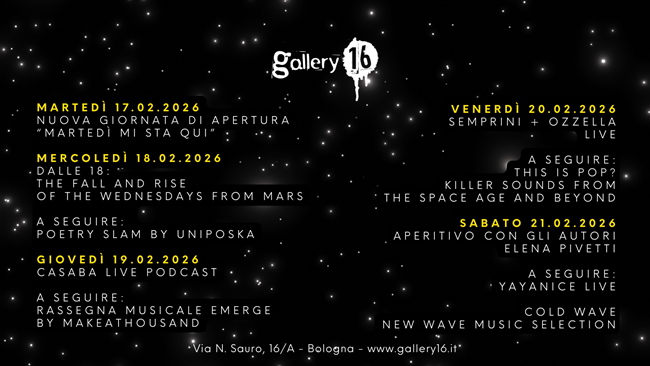BOLOGNA – Gallery16 è lo shop di dischi, libri e il cocktail bar che vi aspetta con una programmazione sempre ricca di eventi live, presentazioni, djset e molto altro.