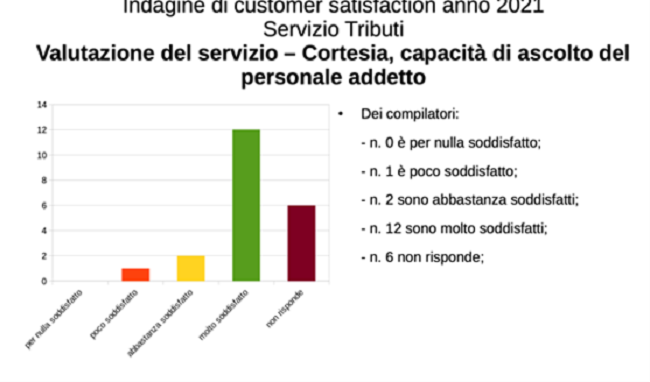 Volti a rilevare il grado di soddisfazione di un utente nell’ottica del miglioramento del servizio, i questionari sono stati esposti negli uffici aperti al pubblico in via sperimentale nel mese di novembre 2021 ed hanno dato la possibilità ai cittadini di esprimere il loro giudizio riguardo il servizio ottenuto presso gli sportelli comunali.