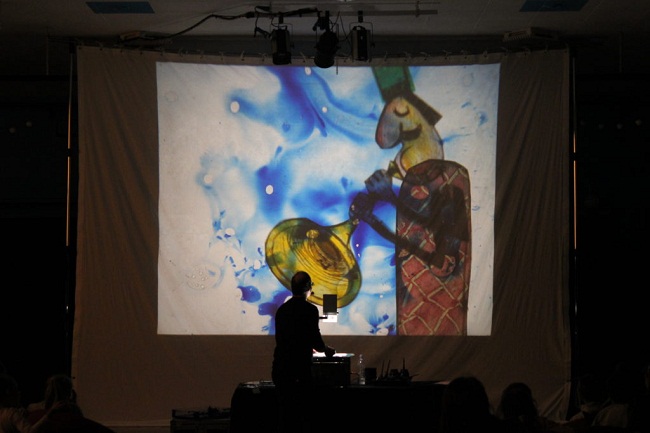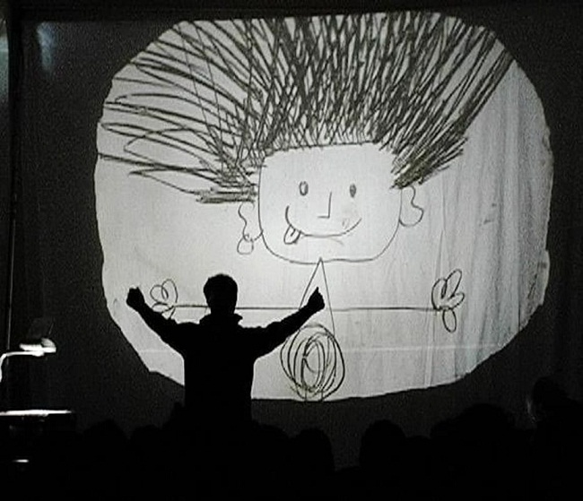 Il racconto si “anima ” mediante l’utilizzo della lavagna luminosa. Nella grande magia della suggestione data dal buio, la lavagna luminosa proietta le immagini ingigantendole, con tecniche diverse: acrilico, collage, acquarello, inchiostri e sabbia, si sviluppano così scenografie bizzarre, divertenti e poetiche. Costruzioni effimere che vivono, crescono e si concludono con la fine del brano. Ad arricchire ulteriormente la scena contribuiscono le ombre di sagome animate, figurine e personaggi cesellati nel metallo o nel cartoncino, che interagiscono fra loro, con la voce narrante e con la musica. Il risultato è quello di un gigantesco libro che si anima, si colora, e si racconta.
