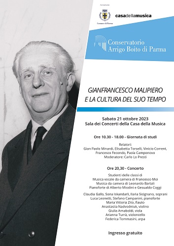 Alle 20.30 seguirà un concerto affidato ad alcuni studenti del Conservatorio di Parma (classi di Musica vocale da camera di Francesco Moi, Musica da camera di Leonardo Bartali, Pianoforte di Alberto Miodini e Gesualdo Coggi): Claudia Gallo, Sona Iskandarli, Ilaria Sicignano (soprani), Luca Leonetti, Stefano Campanini (pianoforte), Maria Vittoria Zito (flauto), Anastasiia Nadvodniuk (violino), Giulia Arnaboldi (viola), Arianna Turrà (violoncello), Federica Tommasini (arpa). Il programma presenterà, in ordine cronologico, una scelta di brani per pianoforte, gruppi di liriche da camera e la Sonata a cinque. Sia nel corso della giornata di studi che durante il concerto sarà inoltre possibile ascoltare alcuni pezzi pianistici e cicli di liriche da camera di carattere umoristico, composti da Malipiero a Parma.