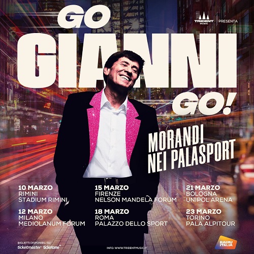 Per il GO GIANNI GO! MORANDI NEI PALASPORT, prodotto da Trident Music, MORANDI ha pensato a una speciale scaletta, un concentrato di vitalità e potenza che mescola i brani frutto del fortunato sodalizio artistico con Jovanotti – L’Allegria, Apri Tutte Le Porte e La Ola – ai classici del suo repertorio, affiancato on stage da una formidabile band di 12 elementi diretta dal Maestro Luca Colombo.
