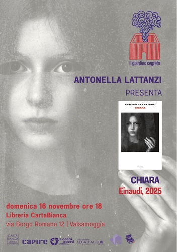 BENTIVOGLIO – BOLOGNA – Il Giardino Segreto ospita Antonella Lattanzi con il suo nuovo libro “Chiara” (Einaudi, 2025). L’appuntamento è presso la libreria Cartabianca di Bazzano domenica 16 novembre alle ore 18 in via borgo Romano 12, Bazzano, Valsamoggia BO.
