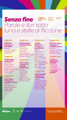 “Senza fine. Parole e libri sotto luna e stelle di Riccione” è un progetto culturale a cura del Comune di Riccione in collaborazione con Block 60 e Mondadori Bookstore Riccione. La rassegna propone un lungo calendario di incontri con gli autori, presentazioni di libri e dialoghi culturali che abbracciano un’estate intera per terminare il 3 settembre. Ingresso libero.