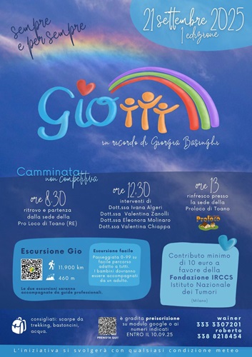 TOANO (RE) – Il prossimo 21 settembre, a Toano, prenderà vita la prima edizione di “Gio – Sempre e per sempre”, una camminata non competitiva nata per ricordare Giorgia Basinghi, la giovane mamma di 24 anni scomparsa troppo presto, e per trasformare il suo sogno in un gesto concreto di amore e solidarietà.