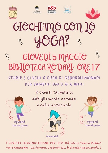 FERRARA – Un pomeriggio di storie e giochi ispirati allo yoga. L’appuntamento, per bambini dai 3 ai 6 anni, è per giovedì 5 maggio 2022 alle 17 alla biblioteca comunale Rodari di Ferrara (viale Krasnodar 102) in compagnia di Deborah Monari.