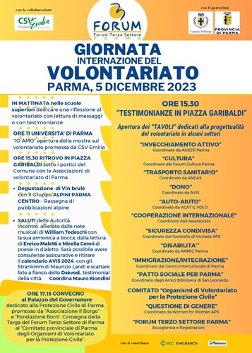 PARMA – Il Forum Terzo Settore Parma, con il patrocinio del Comune e della Provincia di Parma, in collaborazione con il CSV Emilia e di altre associazioni del territorio partecipa alla “Giornata Internazionale del Volontariato” promossa dalle Nazioni Unite che si terrà martedì 5 dicembre 2023 alle ore 15.30 sotto i Portici del Grano in Piazza Garibaldi.