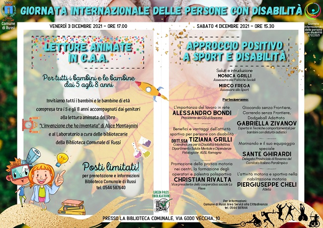 RUSSI (RA) – Si informa la cittadinanza che, in occasione della “Giornata internazionale delle persone con disabilità”, il Comune di Russi organizza due eventi presso la Biblioteca Comunale di Russi, Via Godo Vecchia, 10: