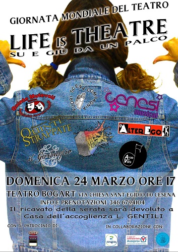 CESENA – Le compagnie teatrali amatoriali di Cesena celebrano la Giornata Mondiale del teatro con uno spettacolo che per la prima volta le vedrà calcare lo stesso palco in un progetto condiviso. “Life is Theatre. Su e giù da un palco” questo il titolo dello spettacolo benefico che andrà in scena domenica 24 marzo 2019 al Teatro Bogart di Sant’Egidio di Cesena alle 17. Sul palco si alterneranno gli attori di Gruppo Genesi Musical, Associazione Liberamente, Compagnia Quinte Strappate, Compagnia Quinte Mutevoli, Associazione Alterego, Compagnia Fuoriscena, Associazione il Garbuglio, Associazione Attori Diversi.