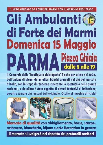 PARMA – Gli Ambulanti di Forte dei Marmi, il mercato di qualità più famoso d’Italia, tornano finalmente a PARMA, a grandissima richiesta, con tutto il meglio del Made in Italy artigianale e le ultime tendenze della moda. Le ormai mitiche “boutique a cielo aperto” dell’originale Consorzio sono attese domenica 15 maggio a PARMA, nella consueta centralissima location di Piazza Ghiaia. Dunque, un appuntamento da non perdere assolutamente per i tanti appassionati del genere, con una giornata che sarà come sempre all’insegna dello shopping più glamour e conveniente, con orario continuato, anche in caso di maltempo, dalle 8 alle 19.