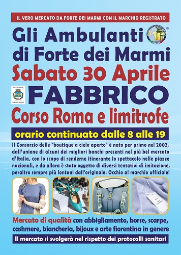FABBRICO (RE) – Gli Ambulanti di Forte dei Marmi, il mercato di qualità più famoso d’Italia, tornano finalmente in Emilia, a grandissima richiesta, con tutto il meglio del Made in Italy artigianale e le ultime tendenze della moda. Le ormai mitiche “boutique a cielo aperto” dell’originale Consorzio sono attese sabato 30 aprile a FABBRICO (Reggio Emilia), nel centro storico tra Corso Roma e le vie limitrofe. Dunque, un appuntamento da non perdere assolutamente per i tanti appassionati del genere, con una giornata che sarà come sempre all’insegna dello shopping più glamour e conveniente, con orario continuato, anche in caso di maltempo, dalle 8 alle 19, e nel rispetto delle indicazioni di sicurezza.