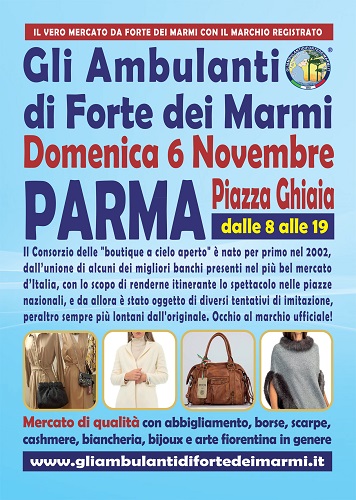 PARMA – Gli Ambulanti di Forte dei Marmi: le bancarelle del mercato di qualità più famoso d’Italia tornano finalmente nel capoluogo ducale, a grandissima richiesta, con tutto il meglio del Made in Italy artigianale e le ultime tendenze della moda. Le ormai mitiche “boutique a cielo aperto” dell’originale Consorzio sono attese domenica 6 novembre a PARMA nella consueta centralissima location di Piazza Ghiaia. Dunque, un appuntamento da non perdere assolutamente per i tanti appassionati del genere, come sempre all’insegna dello shopping più glamour e conveniente, con orario continuato, anche in caso di maltempo, dalle 8 alle 19.