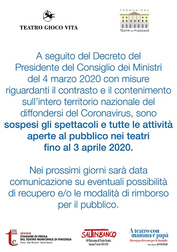 PIACENZA – A seguito del Decreto del Presidente del Consiglio dei Ministri del 4 marzo 2020 con misure riguardanti il contrasto e il contenimento sull’intero territorio nazionale del diffondersi del Coronavirus, sono sospesi gli spettacoli e tutte le attività aperte al pubblico nei teatri fino al 3 aprile 2020.