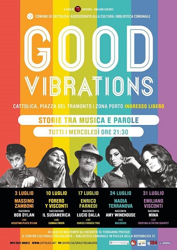 CATTOLICA (RN) – Mercoledì 24 luglio 2019 il quarto appuntamento della nuova edizione di “Good Vibrations” nella splendida cornice della Piazza del Tramonto di Cattolica, zona del porto. A partire dalle 21.30, l’appuntamento con raccontati e suoni per arrivare al cuore della grande musica che ha fatto la storia del Novecento e non solo.