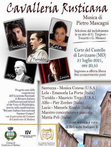 Una scommessa contro il tempo, tra le mille difficoltà tipiche dell’età del Covid, oggi vinta grazie alla volontà di tutti, e pronta a dare un segnale di ripresa e di speranza sulle ali della musica di Mascagni, nel bellissimo territorio emiliano che si distende tra le colline del Lambrusco Grasparossa. Riecheggeranno così, durante la rappresentazione, le celebri note del brindisi “Viva il vino spumeggiante”, perfette per descrivere la natura dell’eccellente vino del territorio. Gli interpreti della serata sono: Monica Conesa (Santuzza), studente presso l’ISV di Philadelphia, ed al suo fianco il tenore messicano Mauricio Trejo (Turiddu), docente della medesima scuola americana; a seguire la sezione dell’Accademia Belcanto Italiano che ha due sedi, una ad Alessandria e l’altra a Castelvetro di Modena, rappresentata da Emanuela La Porta (Lola), Manuela Rinaldi (Mamma Lucia) e Pier Zordan (Alfio); tutti saranno accompagnati e guidati dal Maestro concertatore Mattia Peli, al pianoforte, docente della medesima scuola italiana.