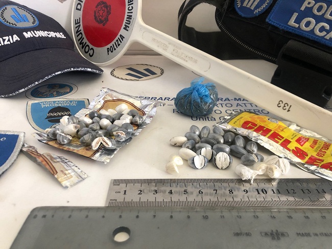 FERRARA – Per il Nucleo Unità Cinofila del Corpo di Polizia Locale Terre Estensi Ultimi gli ultimi giorni di febbraio sono stati caratterizzati da una intensa attività che ha visto entrambi i cani impegnati in consistenti rinvenimenti di sostanza stupefacente. Lunedì scorso, durante il controllo dell’area verde attorno al Grattacielo, occultati sotto il manufatto in cemento di un’aiuola sono stati rinvenuti 12 ovuli di cocaina. Appena due giorni dopo, mercoledì, nel corso del servizio pomeridiano a ridosso delle Mura cittadine, tra via Belvedere e via Porta Catena, i cani hanno fiutato qualcosa che gli Agenti conduttori hanno poi individuato sotto rami e fogliame, come un involucro di hashish del peso di ben 48,39 grammi. Ma il rinvenimento più importante per quantità e per varietà è avvenuto il giorno seguente, giovedì 27 febbraio, nella Via Felisatti. Qui gli operatori hanno recuperato grazie ai cani addestrati Aaron e Chloe, occultati dalla vegetazione spontanea a ridosso dell’isola ecologica, ben 23 ovuli di cocaina, 27 ovuli di eroina, e 4.60 grammi di Marijuana.