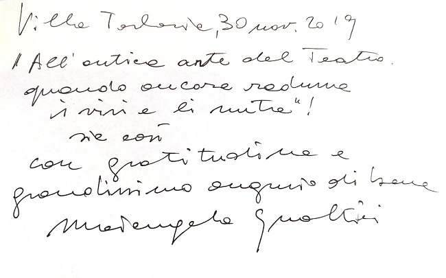 Vi vogliamo salutare con la preziosa dedica di Mariangela Gualtieri ‘donataci’ il 30 Novembre 2019, giorno di inaugurazione della stagione di Villa Torlonia Teatro.
