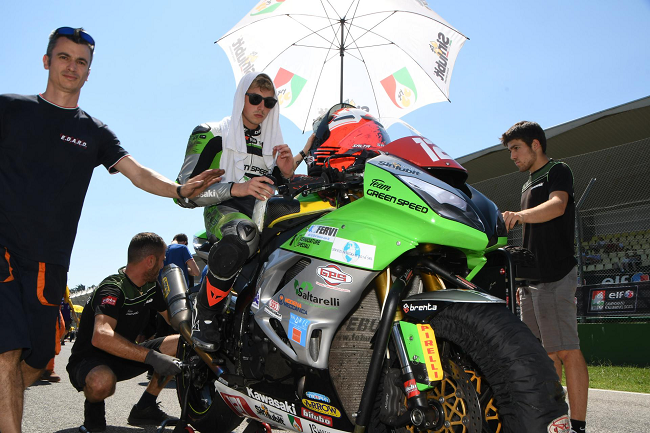 “Una gara strana, un weekend di sole e poi la gara bagnata – commenta il giovane pilota -. Abbiamo scelto le gomme rain, chiaramente, ma optando comunque per un assetto della moto da asciutto visto il meteo incerto. Durante la gara ha invece sempre piovuto, purtroppo, il che mi ha fatto perdere qualche posizione, dopo che ero partito bene e avevo mantenuto la posizione fino agli ultimi giri. Insomma, se non ci fosse stata la pioggia avrei fatto una gran bella prova”.