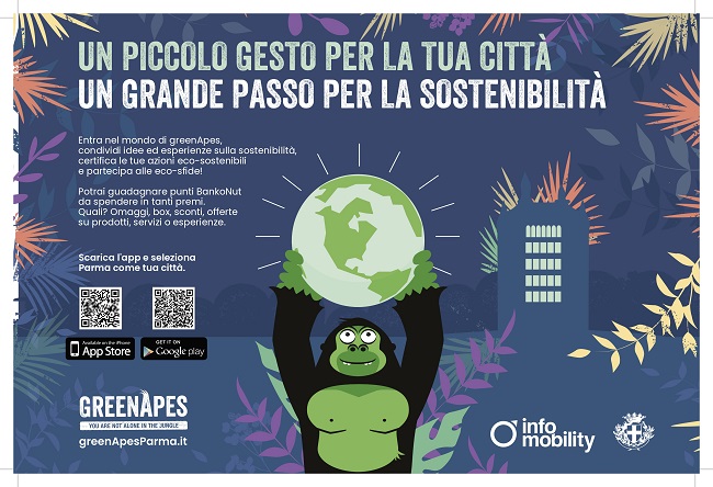 “I cambiamenti delle nostre abitudini, quando parliamo di mobilità e sostenibilità ambientale, sono temi che fanno parte del nostro mondo quotidiano”, dichiara Tiziana Benassi, Assessora alle Politiche di sostenibilità ambientale del Comune di Parma “e capire e automotivarsi al rispetto dell’ambiente è più facile se lo facciamo con un gioco, proprio come GreenApes. Imparare sfidando sé stessi attraverso nuovi obiettivi e sfide ci permette di capire che anche cambiando di poco le nostre abitudini miglioriamo di molto l’ambiente che ci circonda e la città che ci ospita ogni giorno.”
