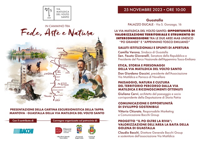 GUASTALLA (RE) – Sabato 25 novembre, alle ore 10 – presso il Palazzo Ducale (via S. Gonzaga, 16) a Guastalla, nel corso di un convegno, aperto al pubblico, dal titolo Opportunità di valorizzazione territoriale e strumento di interconnessione tra le due aree MaB Unesco “Po grande” e “Appennino Tosco Emiliano” – sarà presentata la seconda cartina escursionistica relativa alla tappa Guastalla-Reggio Emilia della Via Matildica del Volto Santo.