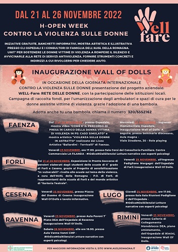 Tante le iniziative messe in campo: incontri, punti informativi, mostre artistiche negli ospedali e nei consultori familiari. Ma anche l’inaugurazione a Cesena, Faenza, Forlì, Ravenna e Rimini del WALL OF DOLLS, l’installazione del ‘Muro della Bambole’ di pezza che potranno essere adottate con una donazione, per contribuire al progetto aziendale di raccolta fondi “WELL-FARE: RETE PER LE DONNE” finalizzato all’umanizzazione degli ambienti di cura nei Pronto Soccorsi della Romagna che accolgono sia le donne che subiscono violenza che i minori. Ecco il dettaglio delle iniziative