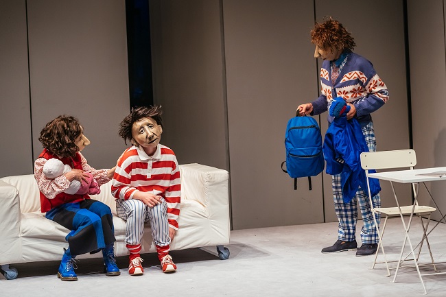 Questa volta c’è una scatola al centro del palco, una scatola delle meraviglie che innesca il gioco fra finzione e realtà. È lo spazio vitale delle figure mascherate che si trasforma: dal paradiso alla casa di una famiglia, fino ai luoghi più diversi. Gli attori si muovono fuori e raccontano la storia attraverso la musica, la manipolazione, il linguaggio (fantastico), il canto e i suoni, le telecamere dal vivo, i disegni: costruiscono il mondo delle maschere davanti agli occhi del pubblico.