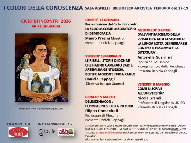 Gli incontri del ciclo hanno valore legale di corso di formazione-aggiornamento ai sensi del DM prot. n. 802 del 19/6/2001, DM prot. n. 10962 dell’8/6/2005. Ai docenti iscritti verrà rilasciato l’attestato di frequenza e agli studenti iscritti l’attestato per accedere al credito formativo (info: gramsciferrara@gmail.com; calicantus@alice.it)