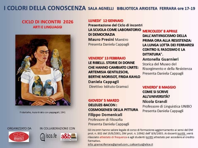 L’incontro, che rientra nel ciclo “I colori della conoscenza. Arti e Linguaggi”, a cura dell’Istituto Gramsci di Ferrara, sarà introdotto da Daniela Cappagli e potrà essere seguito anche in diretta video sul canale youtube Archibiblio web.