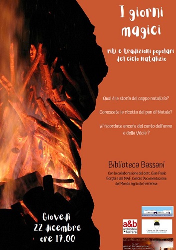 FERRARA – Qual è la storia del ceppo natalizio? Conoscete la ricetta del pan di Natale? Vi ricordate ancora del canto dell’anno e della Vècia? Giovedì 22 dicembre 2022 alle 17 la biblioteca comunale Bassani di via Grosoli 42 (zona Barco, Ferrara) propone un viaggio alla riscoperta delle tradizioni e dei riti del periodo natalizio. L’incontro, dal titolo ‘I giorni magici’, è aperto liberamente a tutti gli interessati ed è organizzato in collaborazione con Gian Paolo Borghi e il MAF, Centro Documentazione del Mondo Agricolo Ferrarese di S. Bartolomeo in Bosco.