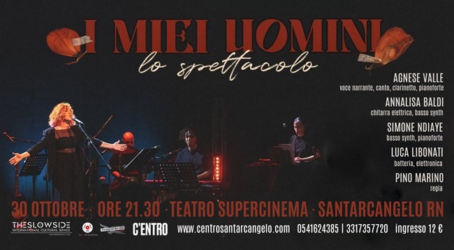 Si comincia mercoledì 30 ottobre alle 21.30 con ‘I Miei Uomini’, un’opera inedita di teatro-canzone scritta e interpretata da Agnese Valle, in scena come voce narrante, canto, pianoforte, clarinetto, accompagnata da Annalisa Baldi alla chitarra e basso synth, da Simone Ndiaye al basso synth e pianoforte, da Luca Libonati alla batteria ed elettronica e da Pino Marino alla regia.