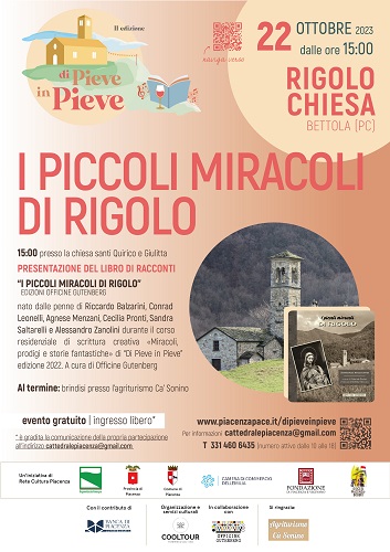 BETTOLA (PC) – Domenica 22 ottobre 2023 appuntamento nella suggestiva cornice di Rigolo Chiesa (Bettola), con la presentazione in anteprima della nuova pubblicazione targata Officine Gutenberg “I piccoli miracoli di Rigolo”: è questo l’ultimo evento di chiusura della seconda edizione della rassegna culturale “Di Pieve in Pieve”, il viaggio alla scoperta di Arte, Musica, Letteratura, Fede e Tradizioni nell’appennino piacentino e parmense.