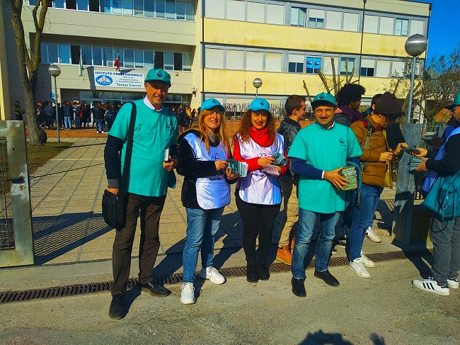 Con determinazione contro le droghe all’uscita delle scuole, così i volontari Mondo Libero Dalla Droga a Cervia, ieri, hanno incontrato i ragazzi della scuola Alberghiera di Piazzale Pellegrino Artusi, 3.