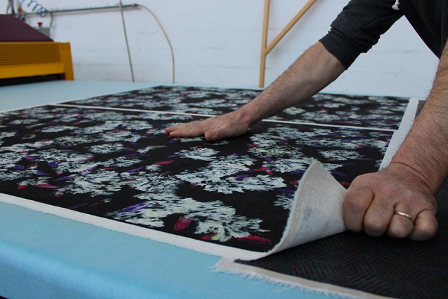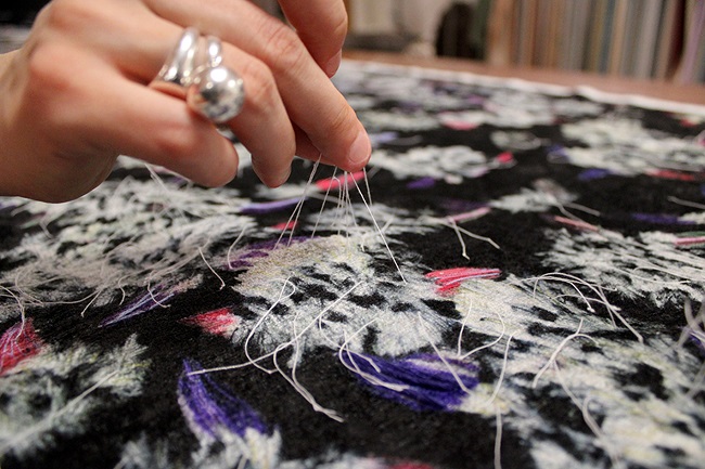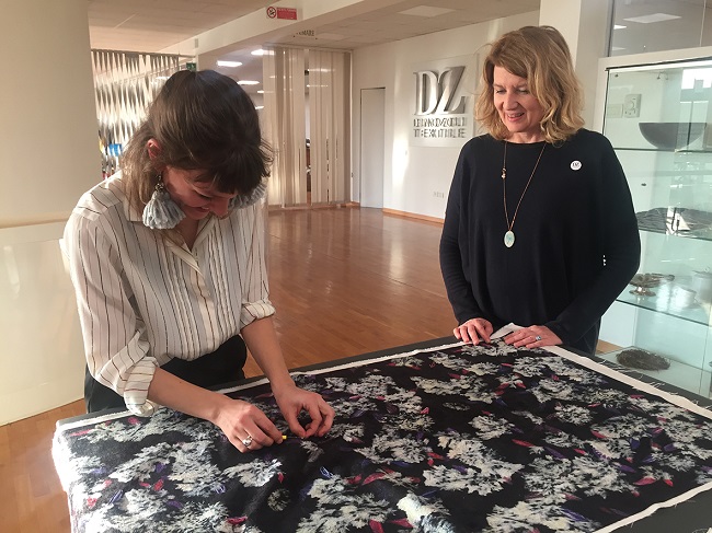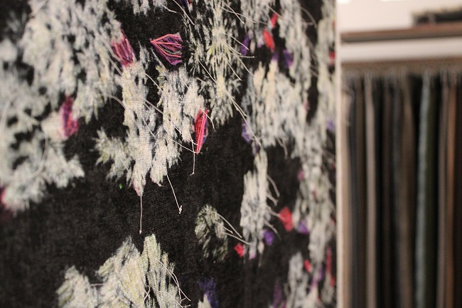 «Sono state fatte dalle tecniche del nostro Ufficio Stile varie prove di stampa per verificare quale tessuto della Dino Zoli Textile potesse essere adatto a valorizzare l’opera di Elena Hamerski – aggiunge Monica Zoli, socia della Dino Zoli Textile. Alla fine si è optato per una ciniglia jacquard in poliestere che esaltasse con la propria struttura tridimensionale la materia mossa dei fiori disegnati dall’artista».