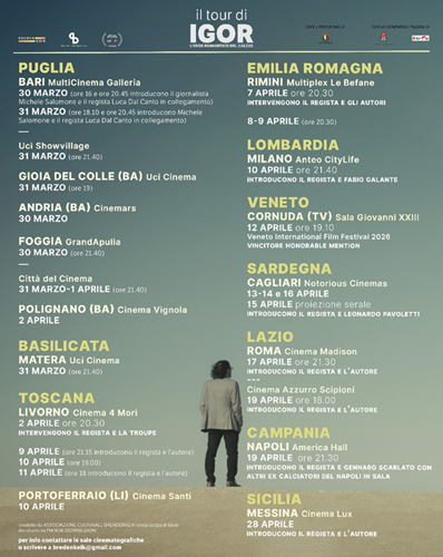 Dopo essere stato presentato in anteprima assoluta alla 17ª edizione del BIF&ST – Bari International Film&Tv Festival Fuori Concorso nella sezione non competitiva A SUD, il documentario IGOR. L’eroe romantico del calcio diretto dal regista Luca Dal Canto è ora in tour nei cinema con proiezioni speciali accompagnate dalla presenza del regista e di ospiti in sala.
