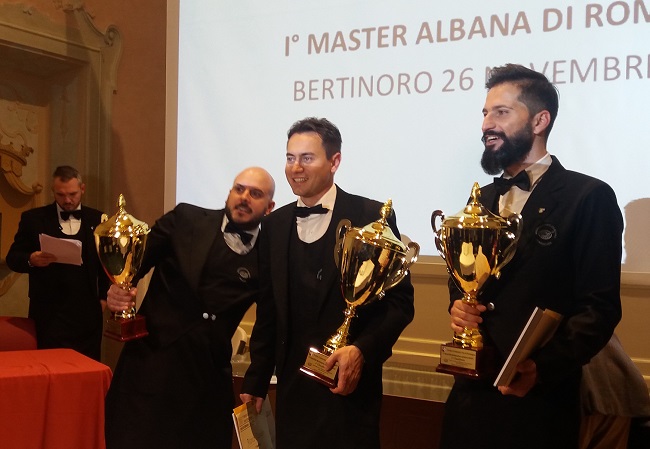 (foto delle premiazioni della prima edizione del Master: al centro il romagnolo Marco Casadei, vincitore della scorsa edizione del Master. A destra Simone Loguercio, secondo classificato al Master dell’Albana 2017 e Miglior Sommelier d’Italia 2018.)