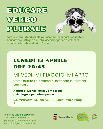 CESENA – Si conclude con un appuntamento dedicato all’autostima e alle relazioni il percorso Educare Verbo Plurale, il ciclo di incontri rivolto a genitori, educatori e adulti impegnati nel complesso e affascinante compito di accompagnare la crescita dei bambini dai 4 agli 10 anni.