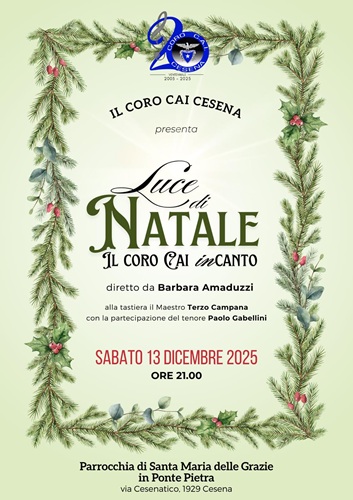CESENA – Il Coro Cai Cesena invita la cittadinanza al concerto natalizio “Luce di Natale”, che si terrà sabato 13 dicembre alle 21 presso la chiesa di Ponte Pietra di Cesena. Il coro è formato da 25 soci della sezione Cai di Cesena. Maestra di coro è Barbara Amaduzzi.Il programma propone canti della tradizione alpina e popolare dedicati al Natale, in un percorso musicale che unisce atmosfere intense e momenti di autentica spiritualità. Un’occasione per condividere insieme l’attesa delle festività in una cornice raccolta e suggestiva.