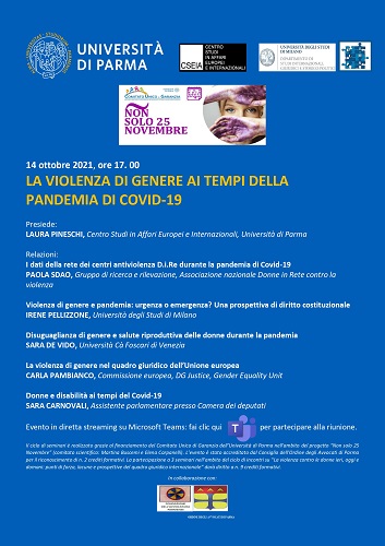 La violenza di genere ai tempi della pandemia di COVID-19 è il tema del secondo seminario fissato per giovedì 14 ottobre, alle 17. Ne discuteranno Sara Carnovali, Assistente parlamentare, Sara De Vido (Università Ca’ Foscari di Venezia), Carla Pambianco (Commissione europea), Irene Pellizzone (Università degli Studi di Milano), Paola Sdao (Associazione D.i.Re). Modererà Laura Pineschi (Università di Parma).