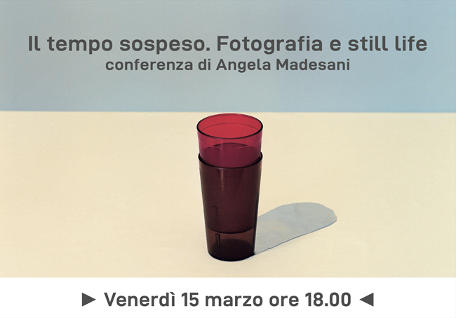 “Il tempo sospeso” potrebbe essere la libera traduzione di “still life”. La conferenza verterà sull’analisi del lavoro di alcuni artisti che hanno lavorato e lavorano con questo tipo di immagini. L’angolazione scelta dalla relatrice è relativa a un ambito prettamente artistico. L’ambito dello still life sarà esaminato attraverso alcune ricerche di artisti che hanno utilizzato la fotografia come strumento, così come Carlo Benvenuto, di cui alcune immagini sono presenti in mostra, ma anche Franco Vimercati, intelligente protagonista dello scenario artistico degli ultimi trent’anni del Novecento, Sergio Scabar, singolare personalità che ha dato vita a immagini in tiratura unica o i più giovani Marco Maria Zanin, Jacopo Valentini e Francesco Del Conte.