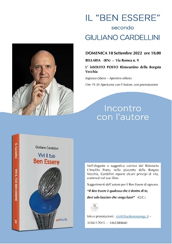 BELLARIA-IGEA MARINA (RN) – Vivi il Tuo Ben Essere arriva a Bellaria Igea Marina. Dopo il successo ottenuto nelle presentazioni di Morciano, Gradara, Monte Cerignone e Pesaro, l’artista ritorna in Romagna, di nuovo in provincia di Rimini, dove presenterà il suo nuovo libro domenica 18 settembre, dalle 18, nell’elegante cornice del ristorantino “L’inSOLITO POSTO”, nella Borgata Vecchia di Bellaria, in via Romea 9. In questo libro sono contenute una serie di riflessioni legate all’ascolto, alla percezione, allo studio, alla sperimentazione reale dello stare bene. Vengono descritti metodi, suggerimenti ed esempi, per raggiungere il proprio personale Ben Essere. Tutto Questo non è mai oggettivo, ma è unico e strettamente individuale, anche se può presentare caratteristiche comuni a tante persone. Il libro di Cardellini è interattivo e, solo in questo modo, può produrre risultati concreti. Si prefigge di indicare alcuni atteggiamenti mentali da tenersi per poter stare bene interiormente, ma il percorso deve essere effettuato da ognuno di noi. È un sistema di riflessioni fattive, le quali, prese singolarmente, possono apparire semplici, ma la loro applicazione concreta, nella loro complessità, non è di facile attuazione e richiede comunque un tempo non proprio breve applicazione. Ad un certo momento, potrà e dovrà succedere che, qualcosa dentro di noi, sgorghi spontaneamente, in maniera naturale e semplice. Questo sarà il primo grande punto di arrivo della nostra serenità interiore, base fondante del nostro Ben Essere.